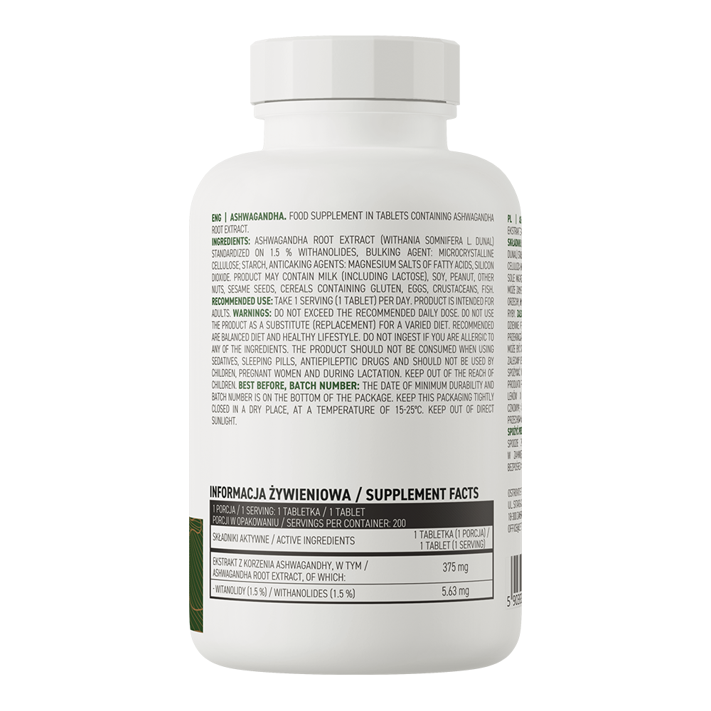 - Contains ashwagandha root extract standardized to 1,5% withanolides – one serving of the food supplement provides the body with 375 mg of extract.