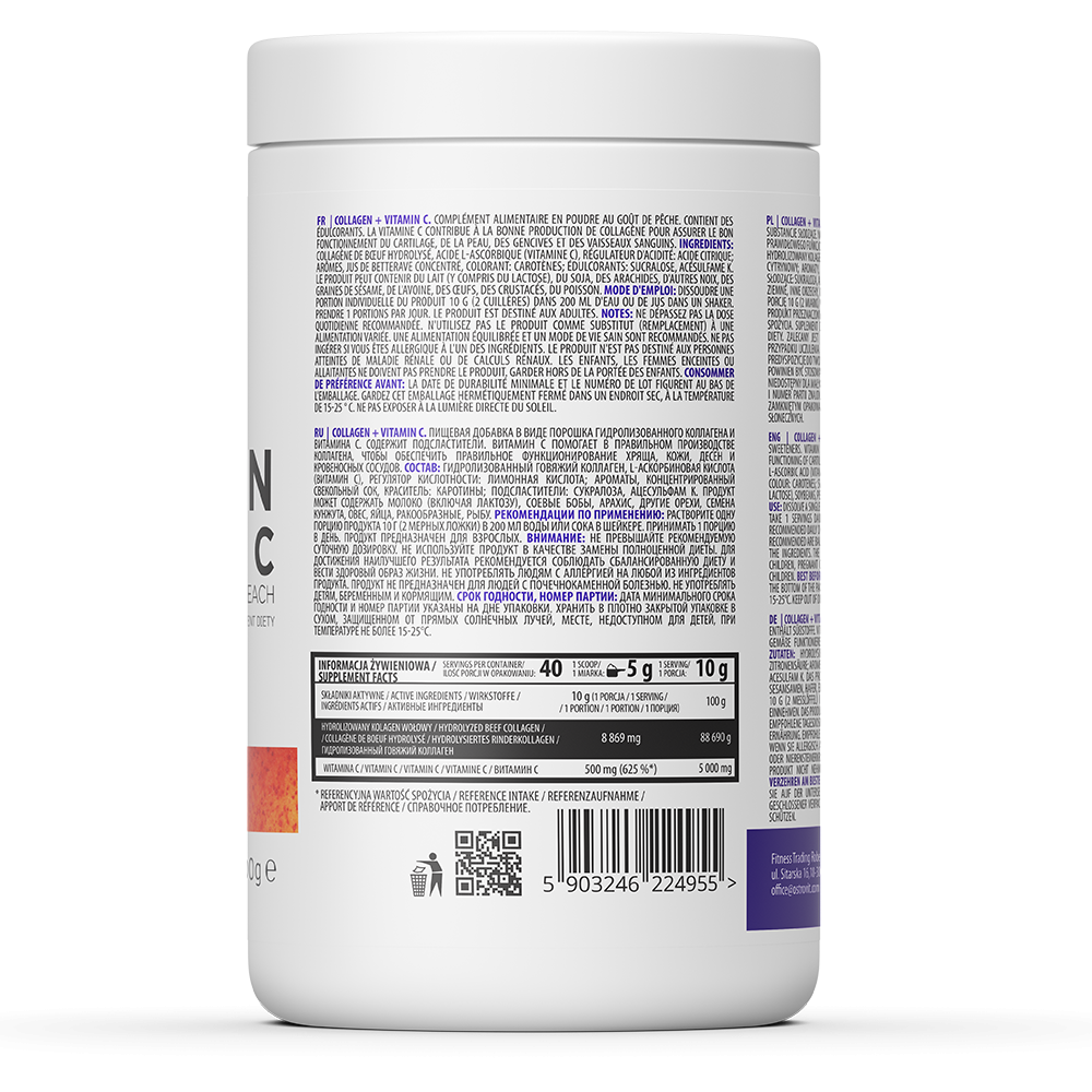 OstroVit Collagen + Vitamin C is a high-quality food supplement, which is a source of hydrolyzed beef collagen and valuable L-ascorbic acid. It is a preparation in the form of powder available in various flavors, which is perfect as a supplement to the daily diet among physically active people and those who care about a healthy and beautiful appearance.