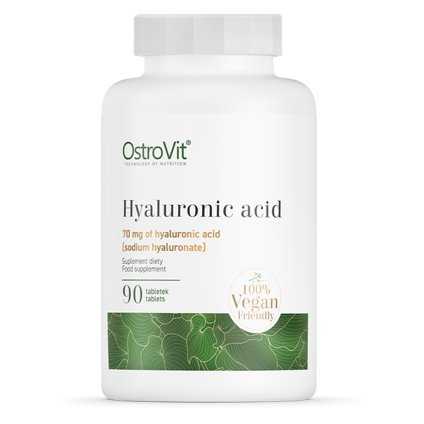 OstroVit Hyaluronic acid is a dietary supplement in tablets that supplements the diet with hyaluronic acid. It is a gel-like water-binding molecule. It acts as a cushioning and filling agent for intercellular spaces in all mammals. It cushions the joints, moisturizes the skin and hair. It can increase skin elasticity and also contribute to the improvement of post-traumatic convalescence.