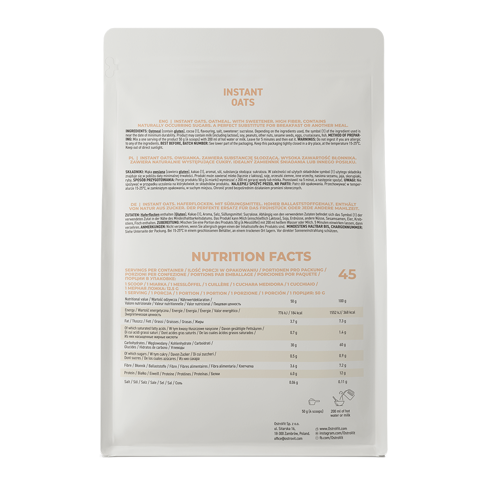 OstroVit Instant Oats is a product created for people who care about healthy and tasty meal. This is a mixture that tastes great with fresh fruit or crunchy nuts. It is an ideal proposition for physically active people, as well as for those who, despite their busy lifestyle, want to follow a healthy diet rich in valuable nutrients.