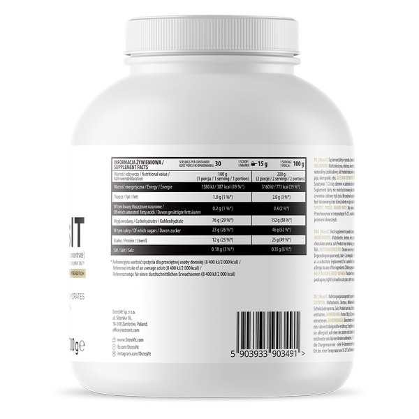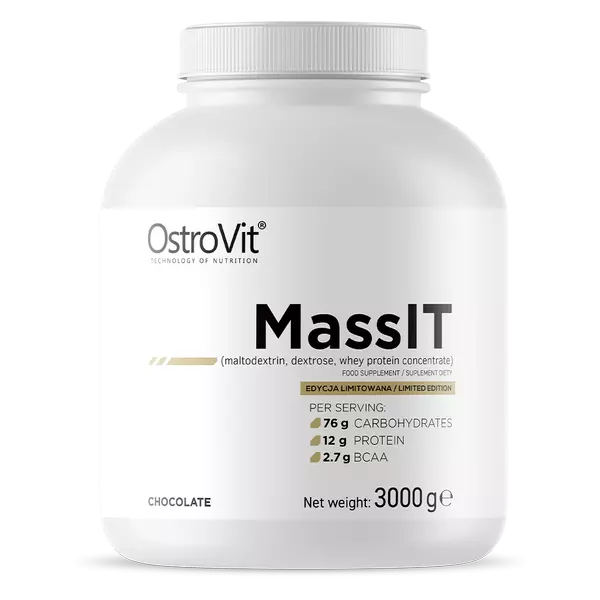 OstroVit Mass IT is a carbohydrate and protein nutrient containing the highest quality carbohydrates and proteins that provide the building material to increase muscle mass. Each serving provides exo- and endogenous amino acids. In its composition, it has carbohydrates with different GI (glycemic index), wax corn starch, maltodextrin and dextrose.